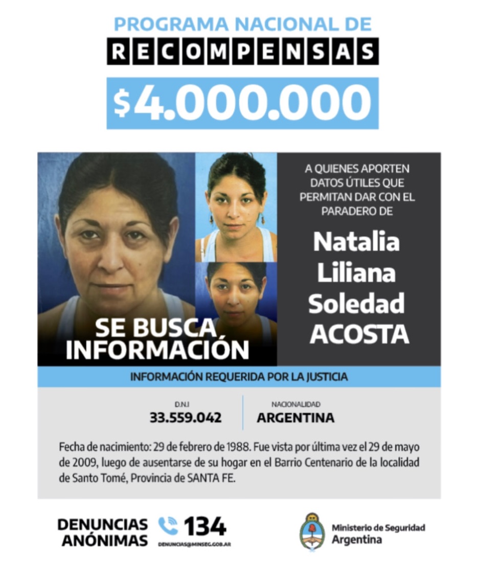 Por otra parte, el trabajo articulado entre diferentes organismos permitió, en cumplimiento de la resolución judicial, aumentar el monto de la recompensa a 4 millones de pesos y difundir tanto la antigua imagen de la joven como las actualizadas, generadas por inteligencia artificial. El afiche generado con las imágenes de cómo se vería hoy Natalia a los 35 años, fue entregado a las fuerzas federales de seguridad para que procedan a su difusión.