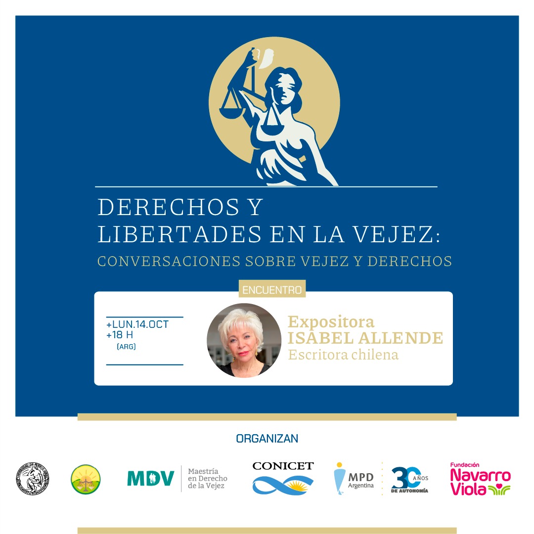 El próximo 14 de octubre a las 18 h se realizará un conversatorio con la presencia de la escritora y periodista chilena Isabel Allende. La actividad, que será parte del Seminario “Derechos y Libertades en la Vejez: Apoyos y cuidados”, versará sobre la temática de la vejez y los derechos, a partir de la trayectoria y experiencias de vida de la autora a sus 82 años de edad. La charla podrá verse a través del canal de YouTube del Instituto Gioja de la Facultad de Derecho de la UBA.