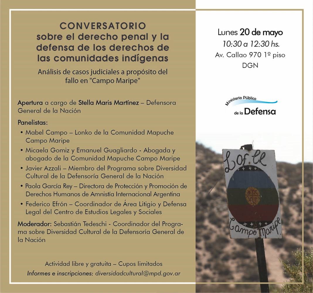 El próximo lunes 20 de mayo en la sede de la Defensoría General de la Nación (Av. Callao 970, 1º piso) se llevará a cabo el “Conversatorio sobre el derecho penal y la defensa de los derechos de las comunidades indígenas: Análisis de casos judiciales a propósito del fallo en Campo Maripe”. La apertura del evento, a desarrollarse entre las 10.30 y 12.30 h, estará a cargo de la defensora general de la Nación, Stella Maris Martínez.