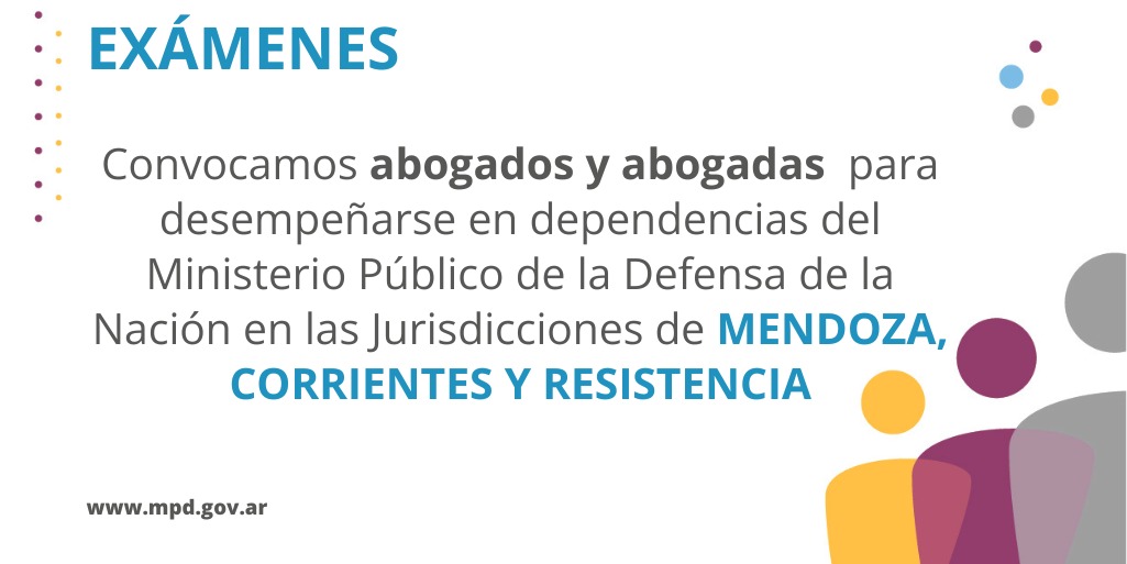 La Defensoría General de la Nación (DGN), a través de la Resolución DGN Nº1108/2023, convoca a examen para el ingreso al agrupamiento Técnico Jurídico (TJ) para desempeñarse en las dependencias del Ministerio Público de la Defensa de la Nación (MPD) con sede en las ciudades de Mendoza (TJ 240), San Rafael (TJ 241), San Luis (TJ 242), San Juan (TJ 243), Villa Mercedes (TJ 244), Corrientes (TJ 245), Paso de los Libres (TJ 246), Goya (TJ 247), Resistencia (TJ 248), Formosa (TJ 249), Presidencia Roque Sáenz Peña (TJ 250) y Clorinda (TJ 251).