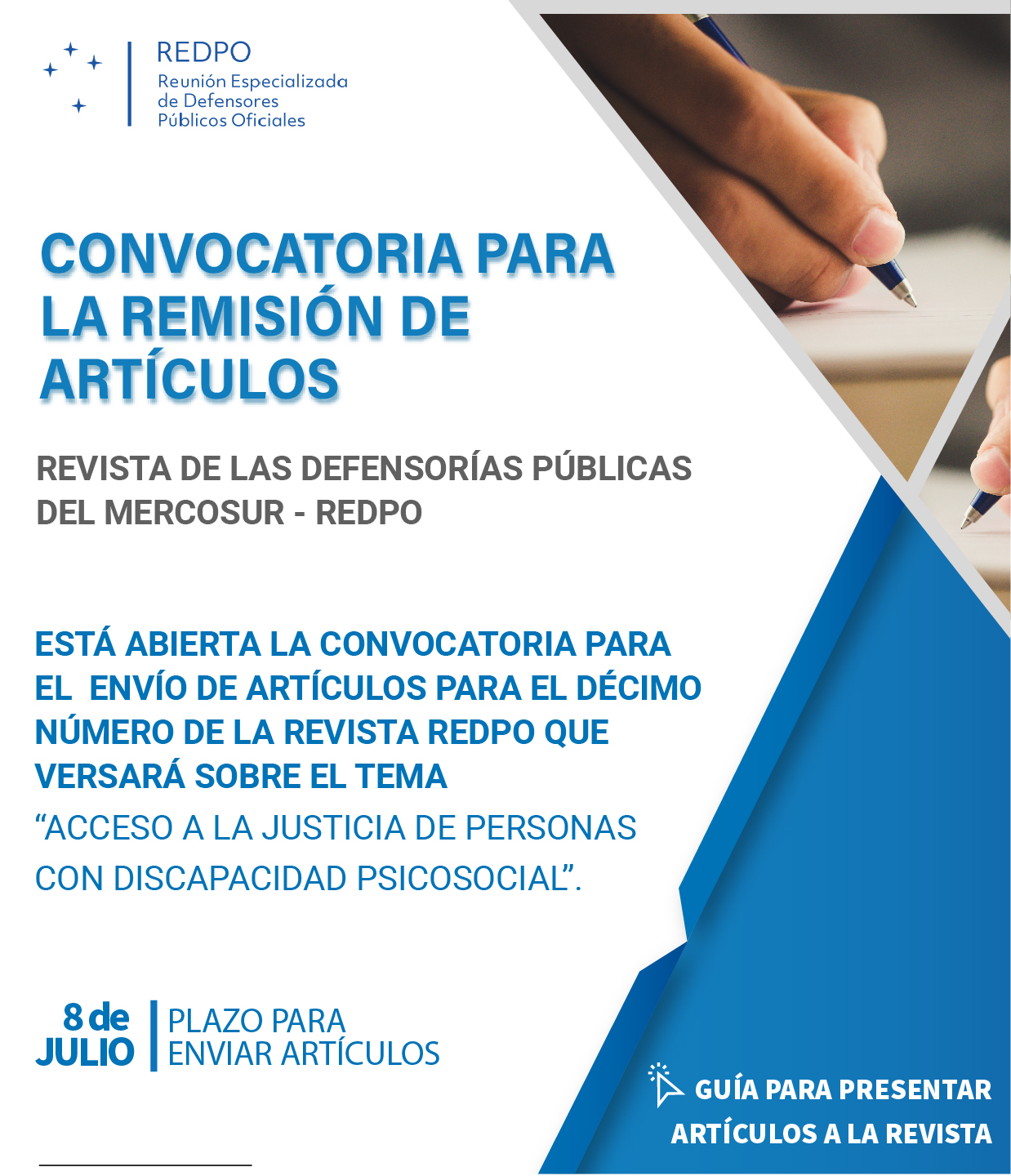 La Reunión Especializada de Defensores Públicos Oficiales del MERCOSUR (REDPO) abrió la convocatoria para enviar artículos para la décima edición de su revista. La temática a tratar en el nuevo número de la Revista de la REDPO es el “Acceso a la Justicia de Personas con Discapacidad Psicosocial”.