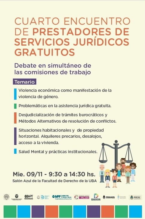 El próximo 9 de noviembre, entre las 9.30 y las 14.30 h, se realizará en el Salón Azul de la Facultad de Derecho de la Universidad de Buenos Aires el “Cuarto Encuentro de la Red de Prestadores de Servicios Jurídicos Gratuitos”. El encuentro tendrá como eje central el debate en simultáneo de cinco comisiones de trabajo con las siguientes temáticas: violencia económica como manifestación de la violencia de género; problemáticas en la asistencia jurídica gratuita; desjudicialización de trámites burocráticos y métodos alternativos de resolución de conflictos; situaciones habitacionales y de propiedad horizontal: alquileres precarios, desalojos, acceso a la vivienda; y salud mental y prácticas institucionales.