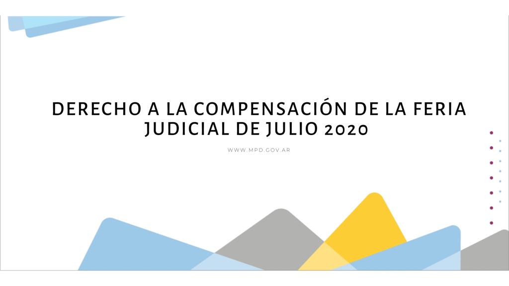 La Defensora General de la Nación (DGN), a través de la Resolución Nº1520/2021, dispuso el derecho a la compensación de los diez (10) días hábiles correspondientes a la feria judicial del mes de julio del año 2020 -suspendida por Resolución DGN Nº 501/2020- a todos/as los magistrados/as, funcionarios/as y empleados/as de este Ministerio Público de la Defensa que hayan prestado funciones durante la feria extraordinaria dispuesta desde el 20 de marzo hasta el 28 de junio de 2020, o se encontraran en uso de alguna de las licencias contempladas en los Arts. 76º (nacimiento de hijo), 81º (guarda con fines de adopción) u 82º (atención de hijos/as menores y/o con discapacidad)- del “RJMPD (T.O. 2020)”.