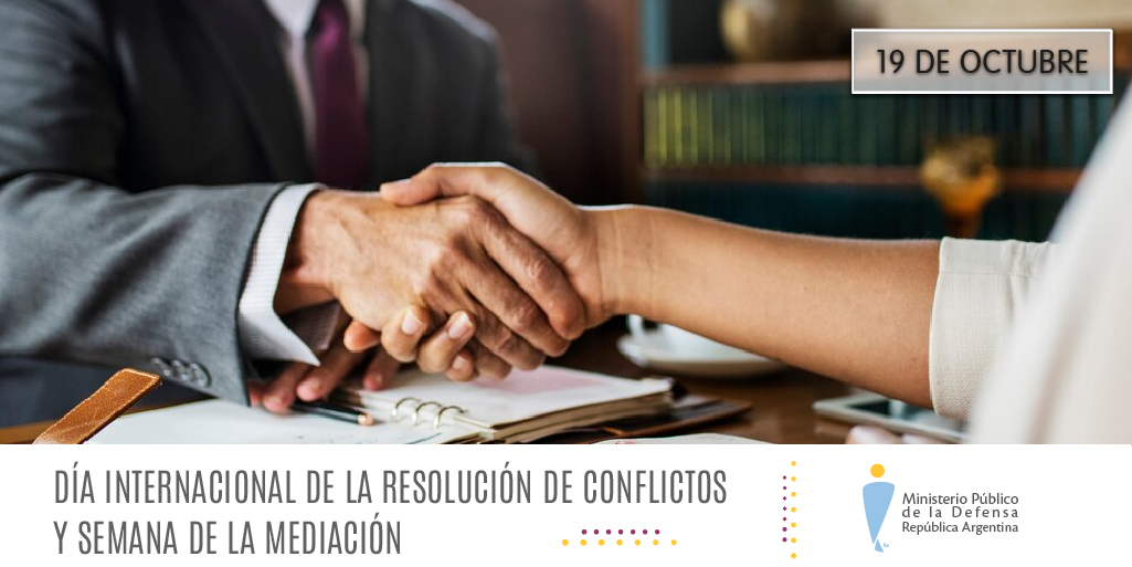 En el mes de octubre se celebran el Día Internacional de la Resolución de Conflictos y la Semana de la Mediación. La Asociación Americana de Abogados estableció la tercera semana de octubre como semana de sensibilización sobre la mediación y su importancia en el trabajo de los operadores jurídicos y en la sociedad en general. Al tiempo que el tercer jueves de octubre fue establecido como día de conmemoración de la resolución de conflictos por la Asociación de Resolución de Conflictos de los Estados Unidos desde el año 2005.