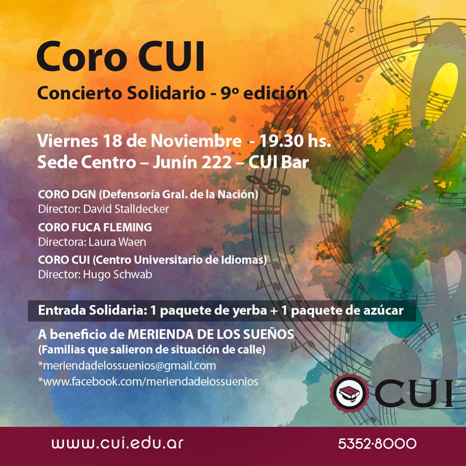 El viernes 18 de noviembre a las 19.30 h, nuestro Coro Institucional participará en un Concierto Solidario en favor de “Merienda de los Sueños” (Familias que salieron de situación de calle), en el Centro Universitario de Idiomas (Junín 222 – CABA).