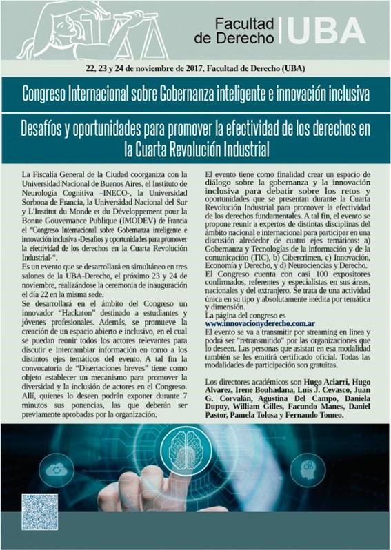 El Ministerio Público de la Defensa brindó auspicio al Congreso Internacional de Gobernanza Inteligente e Innovación Inclusiva, titulado "Desafíos y oportunidades para promover la efectividad de los derechos en la Cuarta Revolución Industrial". La ceremonia de inauguración del evento será el 22 de noviembre y la actividad se desarrollará los días 23 y 24, de 9 a 17.30 h, en la Facultad de Derecho de la Universidad de Buenos Aires (Av. Figueroa Alcorta 2263).