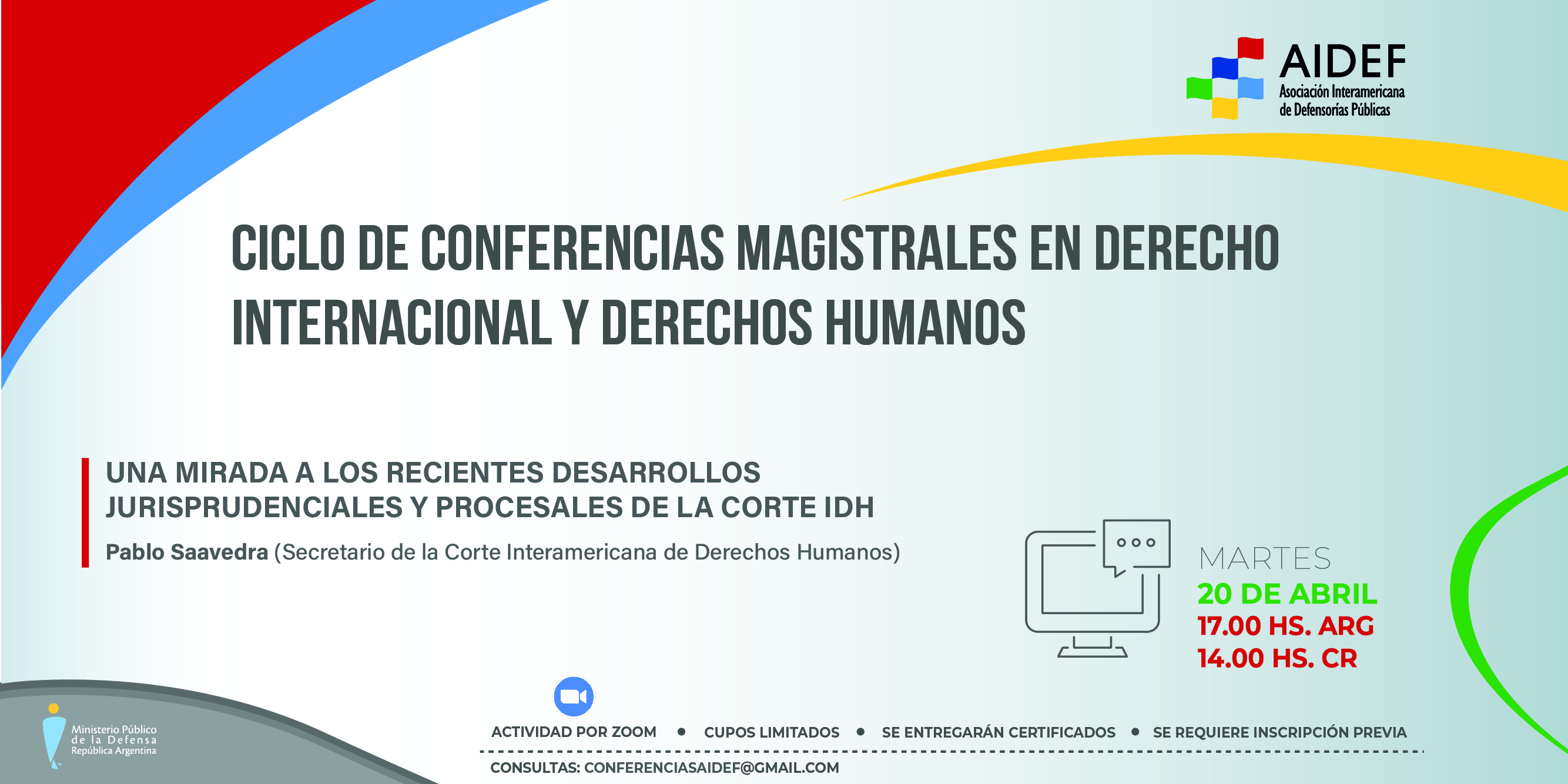 El próximo martes, 20 de abril, a las 17 h de Argentina y 14 h de Costa Rica, el Dr. Pablo Saavedra, secretario de la Corte Interamericana de Derechos Humanos (Corte IDH), brindará la conferencia “Una mirada de los recientes desarrollos jurisprudenciales y procesales de la Corte IDH”. La actividad se realizará en el marco del Ciclo de Conferencias Magistrales en Derecho Internacional y Derechos Humanos que organizan en conjunto la Asociación Interamericana de Defensorías Públicas (AIDEF) y el Ministerio Público de la Defensa de la República Argentina (MPD).