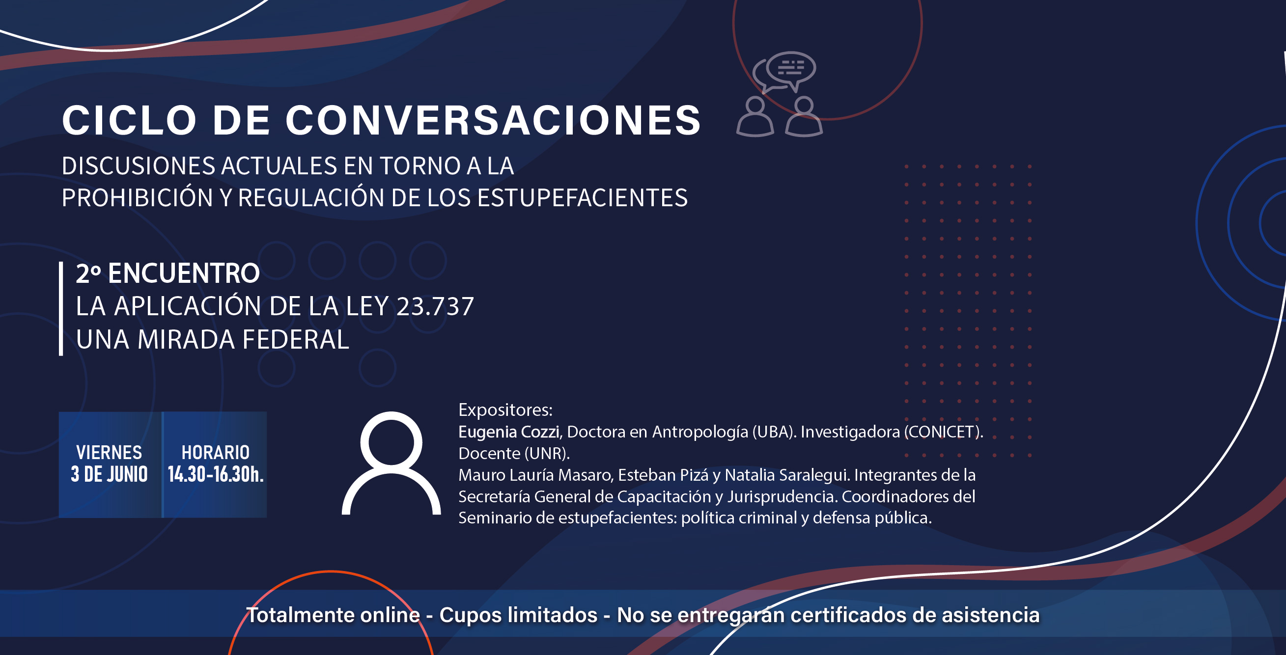 El viernes 3 de junio de 14.30 a 16.30 tendrá lugar el encuentro “La aplicación de la Ley 23.737. Una mirada federal”. En la actividad participarán como expositores/as la Dra. en Antropología e investigadora Eugenia Cozzi junto a los/as Dres/as. Mauro Lauría Masaro, Esteban Pizá y Natalia Saralegui, integrantes de la Secretaría General de Capacitación y Jurisprudencia (SGCJ) de la Defensoría General de la Nación y coordinadores del “Seminario de estupefacientes: política criminal y defensa pública”.