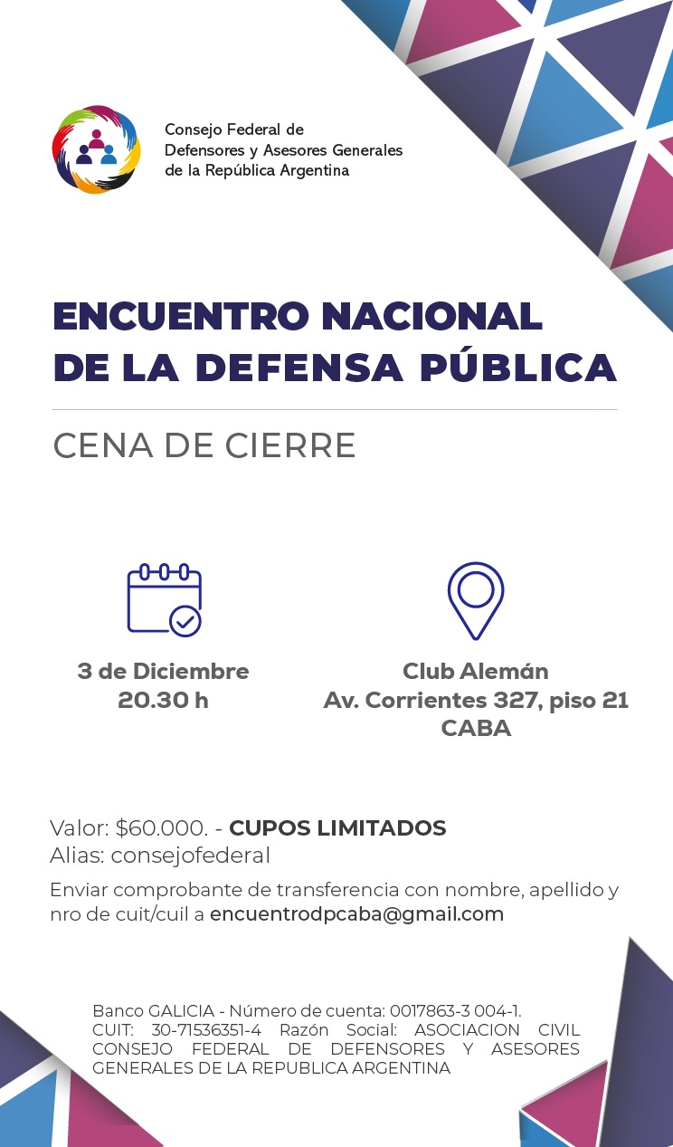 En el marco de este evento, también se realizará una cena de cierre que tendrá lugar en el Club Alemán (Av. Corrientes 327, piso 21, CABA) el 3 de diciembre a las 20.30 h. La cena tiene cupos limitados y un valor de $60.000 que debe pagarse por transferencia bancaria al alias: consejofederal