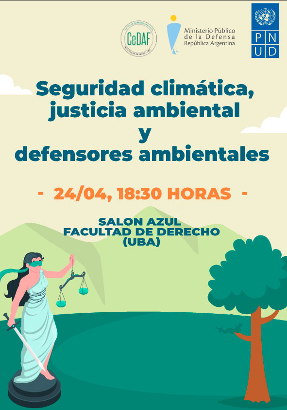 El próximo Lunes 24 de abril a las 18.30hs. (hora Argentina) se realizará el encuentro “Seguridad climática, justicia ambiental y defensores ambientales”, organizado por el Ministerio Público de la Defensa de la Nación (MPD), el Programa de las Naciones Unidas para el Desarrollo (PNUD) y el Centro de Derecho Ambiental de la Facultad de Derecho (UBA).