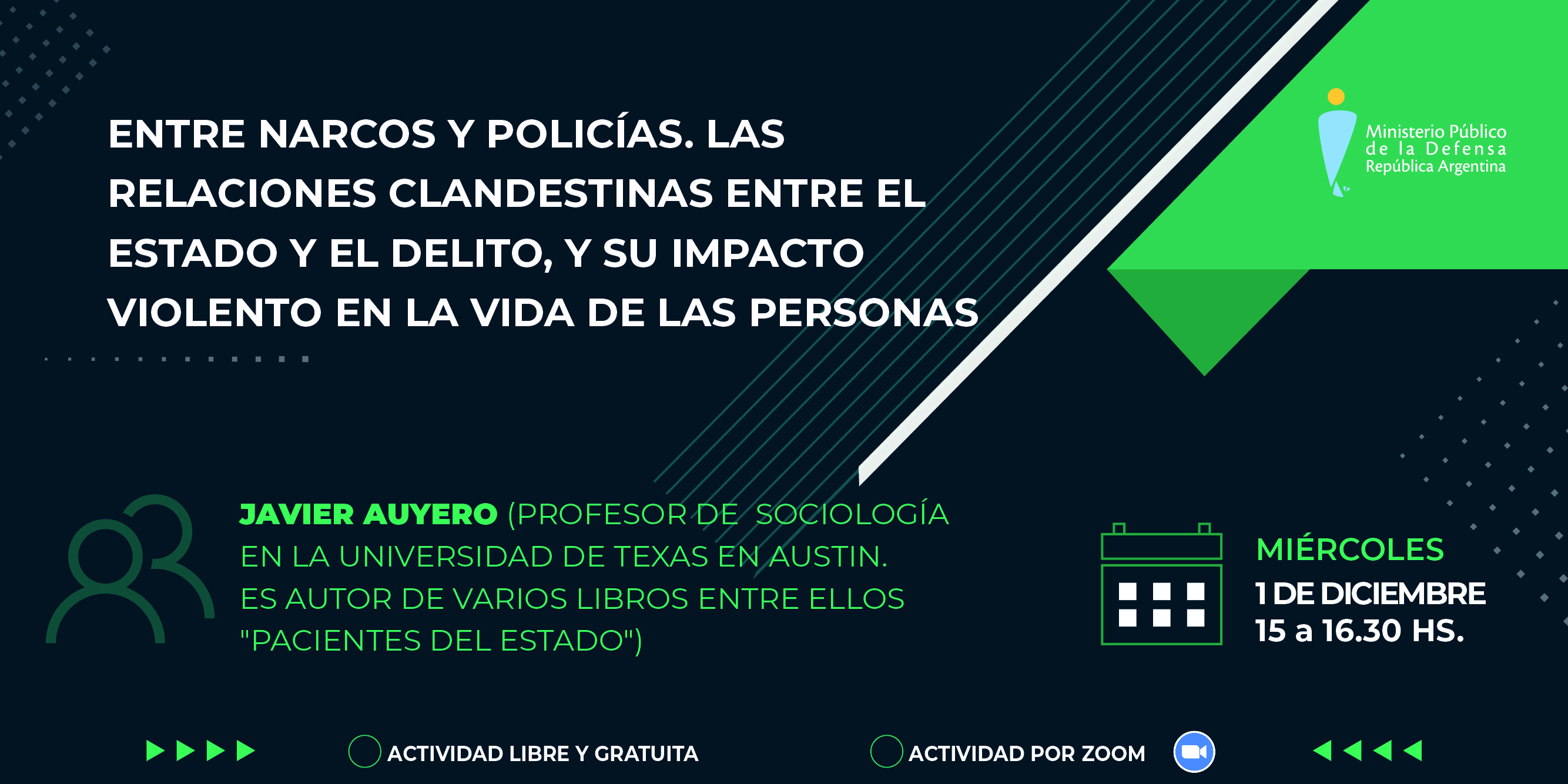 La Secretaría General de Capacitación y Jurisprudencia de la Defensoría General de la Nación invita a participar el próximo miércoles 1° de diciembre de 15 a 16.30 h de una actividad de capacitación que se centrará en el libro "Entre narcos y policías. Las relaciones clandestinas entre el Estado y el delito y su impacto violento en la vida de las personas", publicado este año por Siglo XXI Editores.