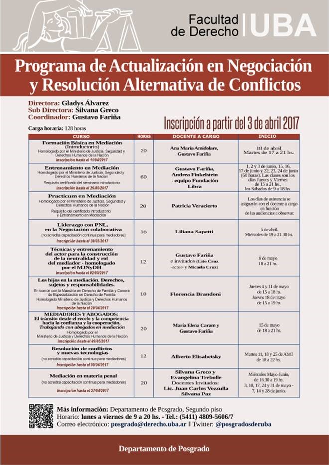 La Defensoría General de la Nación invita a participar en los cursos del posgrado “Programa de Actualización en Negociación y Resolución Alternativa de Conflictos”, organizado por la Facultad de Derecho de la Universidad de Buenos Aires.