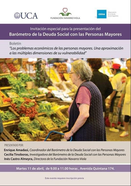 El Programa de Salud, Discapacidad y Adultos Mayores de la Defensoría General de la Nación les hace llegar la invitación especial para la presentación del Barómetro de la Deuda Social con las Personas Mayores, boletín “Los problemas económicos de las personas mayores. Una aproximación a las múltiples dimensiones de la vulnerabilidad”, que se realizará el martes 11 de abril de 9 a 11 h, en el auditorio de la Fundación Navarro Viola (Avenida Quintana 174 – CABA).
