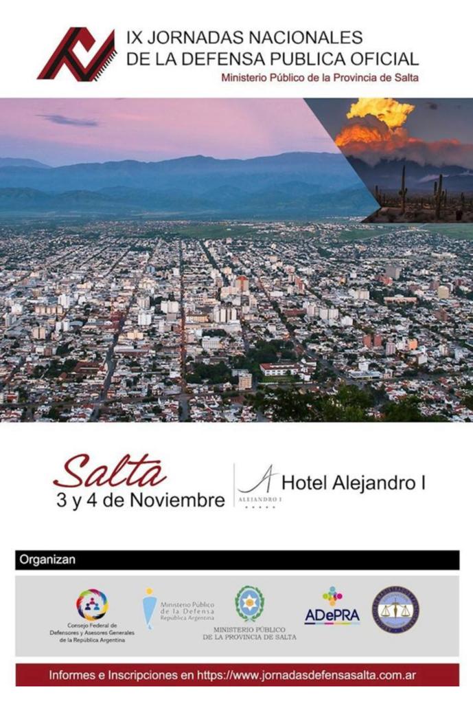Los próximos 3 y 4 de noviembre se realizarán las IX Jornadas Nacionales de la Defensa Pública en el Hotel Alejandro I de la provincia de Salta. El evento está organizado por el Ministerio Público de la Defensa de la Nación (MPD), el Consejo Federal de Defensores y Asesores Generales de la República Argentina, el Ministerio Público de la Provincia de Salta, la Asociación de Defensores Públicos de la República Argentina (ADEPRA) y la Asociación de Magistrados y Funcionarios de la Justicia Nacional.