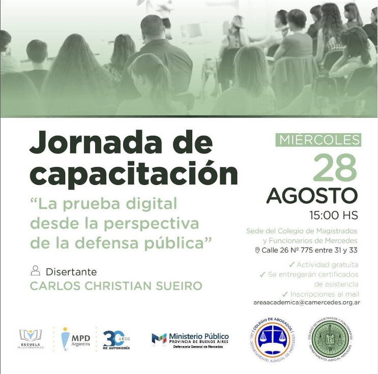 El próximo miércoles 28 de agosto a las 15 h se llevará a cabo en la ciudad de Mercedes, Buenos Aires, la jornada de capacitación “La prueba digital desde la perspectiva de la defensa pública”. La actividad está enmarcada en el ciclo realizado en conjunto con diversas asociaciones de magistrados y funcionarios y colegios de abogacía del país, con el fin de acercar a la población el servicio que brinda el Ministerio Público de la Defensa (MPD).