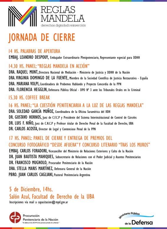 La jornada comenzará a las 14 horas con las palabras del embajador extraordinario plenipotenciario, representante especial para DDHH, Leandro Despouy. A partir de las 14.30 se desarrollará una disertación sobre las “Reglas Mandela en acción”, en la que expondrán Raquel Munt, directora nacional de mediación del Ministerio de Justicia y DDHH de la Nación; Mariana Volpi, coordinadora de “Probemos Hablando” y “Proyecto Concordia” de la PPN; Florencia Hegglin, defensora pública oficial ante los Tribunales Orales en lo Criminal; y Virginia Domingo De la Fuente, miembro de la Sociedad Científica de Justicia Restaurativa de España.