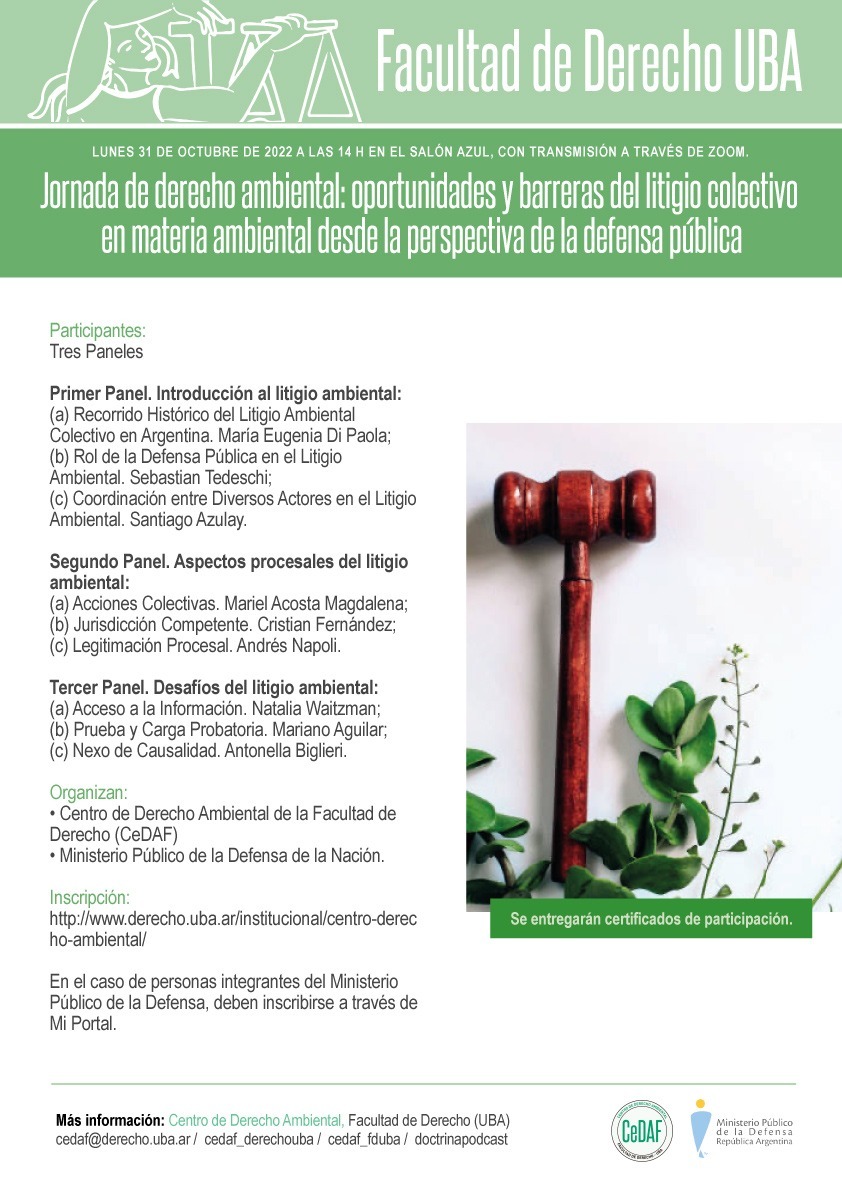 El próximo 31 de octubre a las 14 h, se realizará en el Salón Azul de la Facultad de Derecho de la Universidad de Buenos Aires la “Jornada de derecho ambiental: oportunidades y barreras de litigio colectivo en materia ambiental desde la perspectiva de la defensa pública”. El evento está organizado por el Ministerio Público de la Defensa (MPD) y por el Centro de Derecho Ambiental de la Facultad de Derecho.