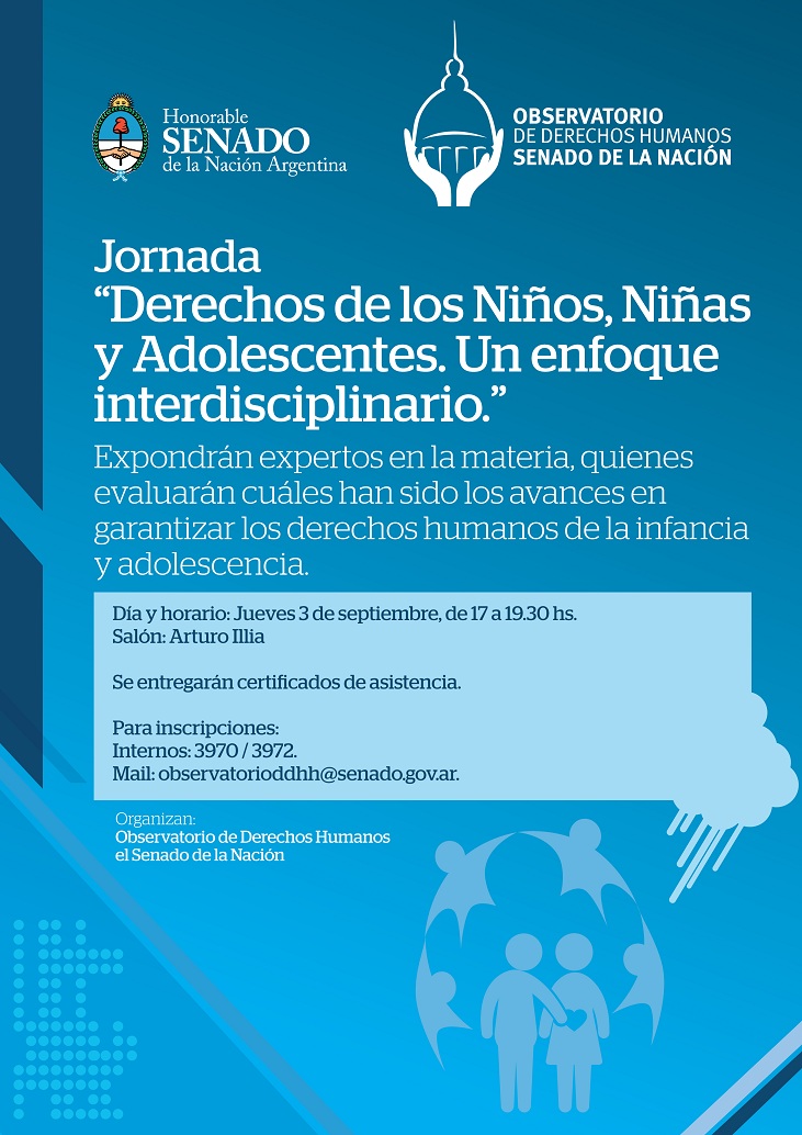 El día 3 de septiembre de 2015 se realizará la “Jornada ´Derechos de los Niños, Niñas y Adolescentes. Un enfoque interdisciplinario”, organizada por el Observatorio de Derechos Humanos del Honorable Senado de la Nación, en el Salón Illia del Congreso de la Nación, ubicado en Hipólito Yrigoyen 1849, primer piso, Ciudad Autónoma de Buenos Aires.