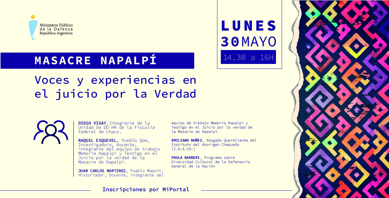 El próximo lunes 30 de mayo a las 14.30 h. se realizará la jornada “Masacre Napalpí: voces y experiencias en el juicio por la verdad", organizado por la Secretaría General de Capacitación y Jurisprudencia de la Defensoría General de la Nación (DGN). El encuentro contará con la presencia de la Dra. Paula Barberi, integrante del Programa sobre Diversidad Cultural de la DGN; el Dr. Diego Vigay, integrante de la Unidad de DDHH de la Fiscalía Federal de Chaco; Raquel Esquivel y Juan Carlos Martínez, integrantes del equipo de trabajo Memoria Napalí; y el Dr. Emiliano Núñez, abogado querellante del Instituto del Aborigen Chaqueño.