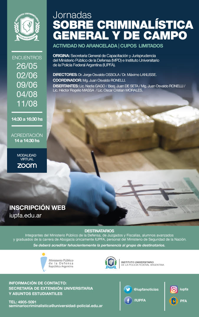 El Instituto Universitario de la Policía Federal (IUPFA) y la Secretaría General de Capacitación y Jurisprudencia de la Defensoría General de la Nación (DGN) invitan a los/as integrantes del Ministerio Público de la Defensa (MPD) a participar de las jornadas que co-organizan sobre criminalística general y de campo.