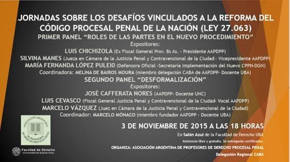 El martes 3 de noviembre a las 18 hs se llevará a cabo en el Salón Azul de la Facultad de Derecho de la UBA las “Jornadas sobre los desafíos vinculados a la reforma del Código Procesal Penal de la Nación (Ley 27.063)”, organizada por la Asociación Argentina de Profesores de Derecho Penal.