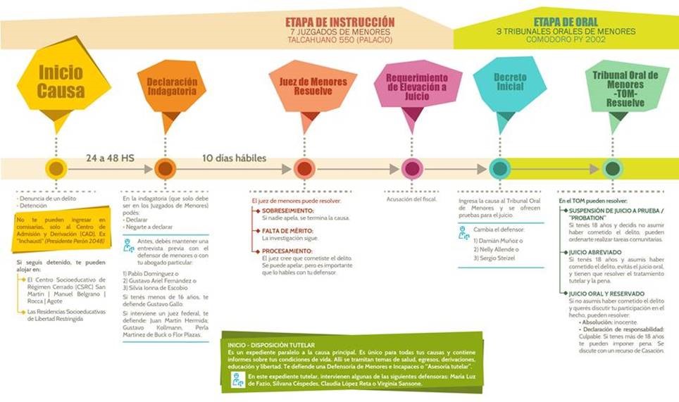 La Comisión de Seguimiento del Tratamiento Institucional de Niñas, Niños y Adolescentes (NNyA) de la Defensoría General de la Nación elaboró un folleto que sintetiza los pasos del proceso penal juvenil en la justicia nacional.
