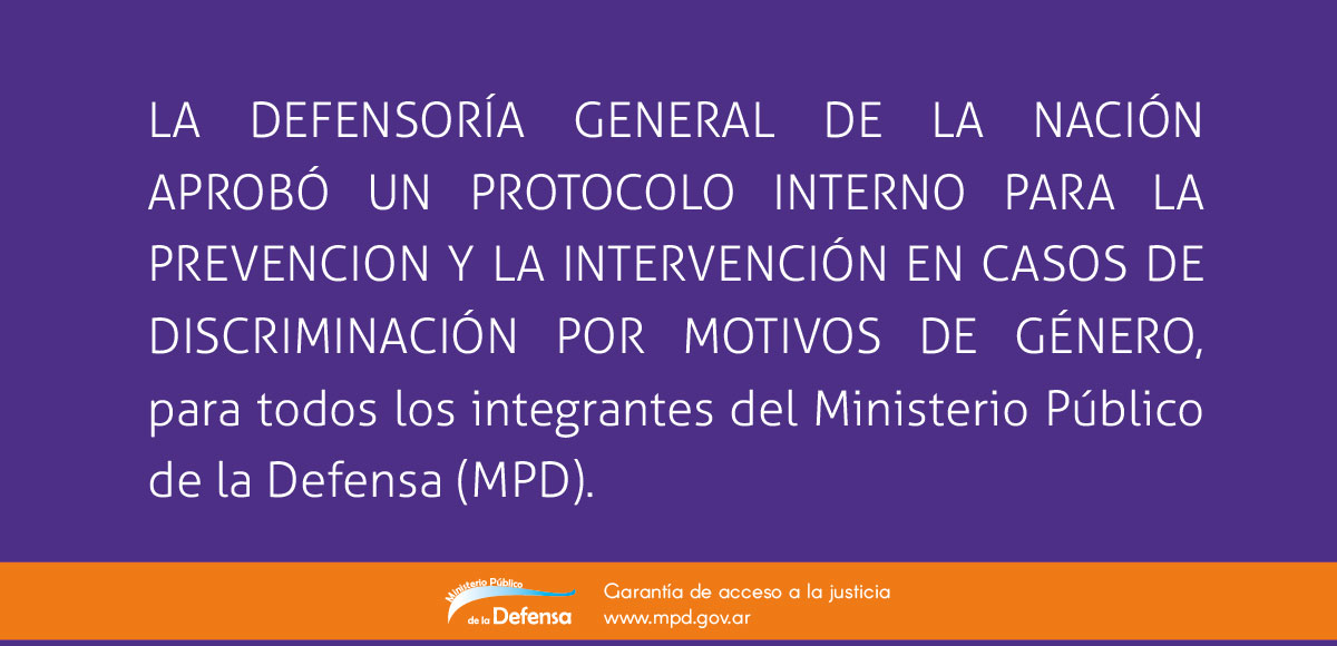 La defensora general de la Nación, Stella Maris Martínez, aprobó el pasado 19 de junio, un Protocolo de actuación para la prevención y la intervención en casos de discriminación por motivos de género, para todo el personal que integra el Ministerio Público de la Defensa (MPD). También modificó el Régimen Jurídico del MPD y dispuso que magistrados/as, funcionarios/as y empleados/as en ejercicio de sus funciones deberá actuar de manera respetuosa y sin discriminación alguna con los/as demás integrantes del MPD, y con las y los integrantes del sistema de administración de justicia; así como también con sus asistidos/as y familiares.