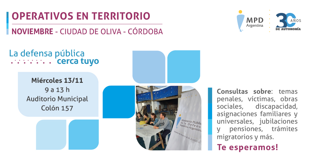 La Defensoría Pública Oficial ante el Juzgado Federal de Primera Instancia de Villa María, a cargo de la Dra. María Luz Felipe, estará respondiendo consultas de vecinos y vecinas de la ciudad de Oliva.