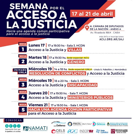 El evento constará de cinco encuentros con el formato de mesas redondas. Los temas a desarrollar serán: “acceso a la justicia y villas”, “acceso a la justicia y género”, “acceso a la justicia y discapacidad”, “acceso a la justicia y ministerios públicos”, y “hacia una agenda común participativa para el acceso a la justicia”.