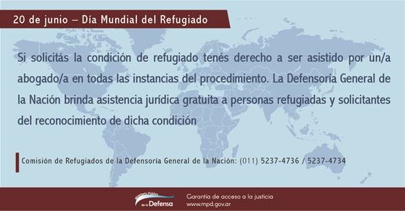 Comisión para la Asistencia Integral y Protección al Refugiado y Peticionante de Refugio de la Defensoría General de la Nación: Av. Belgrano 1177, 2º piso, Ciudad de Buenos Aires, (011) 5237-4736 / 4734