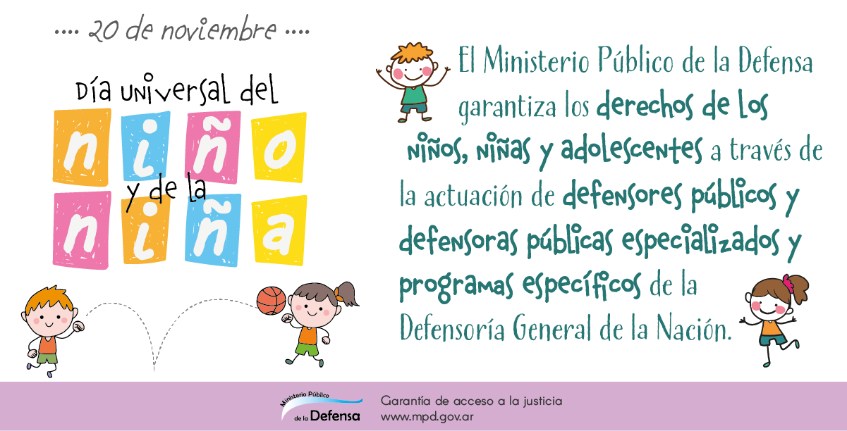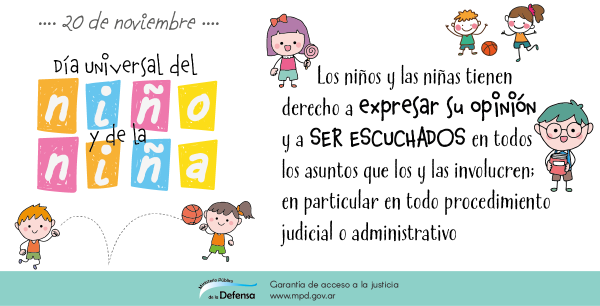 En este día la defensora general de la Nación, Stella Maris Martínez, convoca al personal del Ministerio Público de la Defensa a seguir trabajando a fin de que se cumplan y garanticen efectivamente los derechos humanos de las niñas, niños y adolescentes, de acuerdo a lo establecido en la Convención de los Derechos del Niño; haciendo hincapié en los cuatro principios que rigen para su implementación: la no discriminación; el interés superior del niño; el derecho a la vida, a la supervivencia y al desarrollo; y el respeto de la opinión del niño.