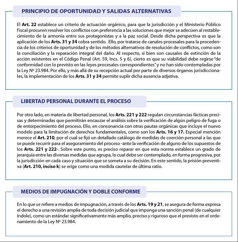 Esos artículos e institutos, ya en uso, se vinculan con las medidas alternativas al castigo penal; con los derechos de las personas víctimas en los conflictos en lo que hace a su intervención sobre la disposición de la acción penal; la libertad procesal durante el proceso y el derecho a contar con una revisión judicial amplia (doble conforme). A continuación, se analizará cada norma en particular, en cuanto a su posible incidencia enla gestión de los casos sobre los cuales se brinda el servicio de defensa pública desde este Ministerio.