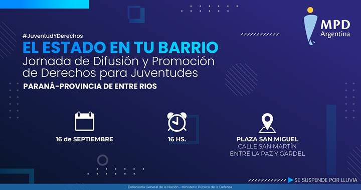El Equipo Acceder de la Defensoría General de la Nación (DGN), a cargo del Dr. Mariano Gutiérrez, participará mañana de la “Jornada de Difusión y Promoción de Derechos para Juventudes”, organizada por el programa nacional “El Estado en tu barrio”. La actividad tendrá lugar en Paraná, provincia de Entre Ríos, y comenzará a las 16 h.