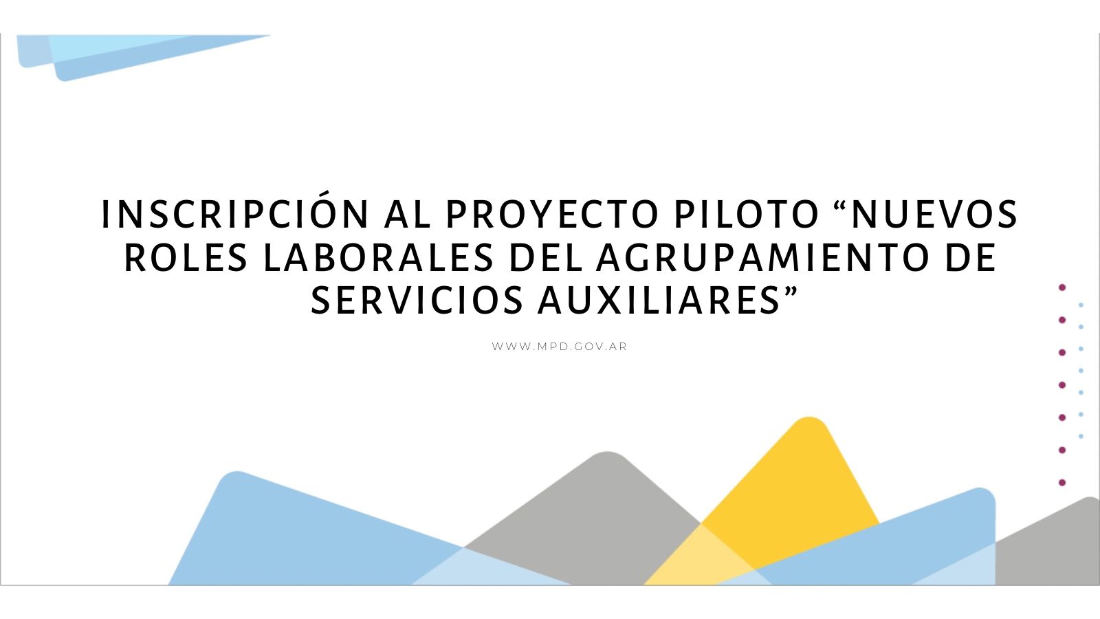 Con el fin de implementar este proyecto, se solicita a las/os titulares a cargo de las dependencias del Ministerio Público de la Defensa que informen acerca de la posibilidad de inscribirse en la modalidad y fecha antes mencionadas a los agentes que prestan funciones en el escalafón de Servicios Auxiliares.