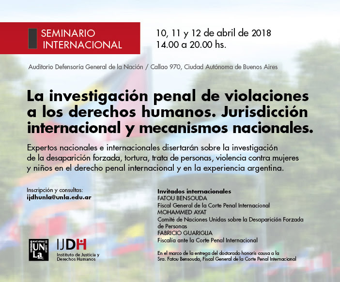 El seminario, que se extenderá hasta el 12 de abril inclusive, es organizado por el Instituto de Justicia y Derechos Humanos “Luis Eduardo Duhalde” de la UNLa, y abordará las temáticas, las prácticas y los problemas en torno a la investigación penal de violaciones a los derechos humanos por parte de los organismos internacionales (la Corte Penal Internacional y otros órganos de tratados) así como la experiencia en Argentina.