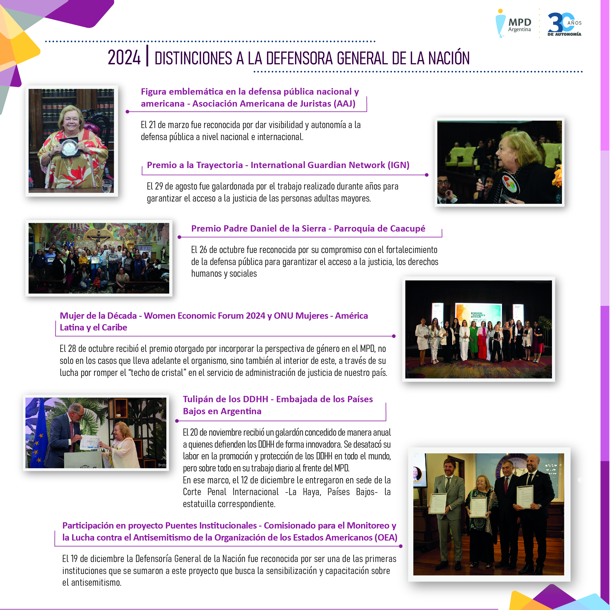 A lo largo de este año, he tenido el honor de recibir importantes distinciones por mi labor en la defensa de los derechos humanos, el acceso a la justicia y el fortalecimiento de la defensa pública, tanto a nivel nacional como internacional.