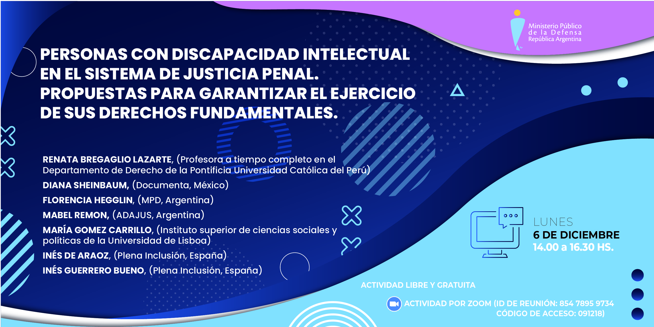 Los y las invitamos a la actividad "Personas con discapacidad intelectual en el sistema de justicia penal. Propuestas para garantizar el ejercicio de sus derechos fundamentales". Contaremos con la presencia de Renata Bregaglio Lazarte (Profesora a tiempo completo en el Departamento de Derecho de la Pontificia Universidad Católica del Perú), Diana Sheinbaum (Documenta, México), Florencia Hegglin (MPD, Argentina), Mabel Remón (ADAJUS, Argentina), María Gómez Carrillo (Instituto superior de ciencias sociales y políticas de la Universidad de Lisboa), Inés De Araoz (Plena Inclusión, España) e Inés Guerrero Bueno (Plena Inclusión, España).