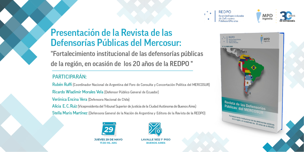 El próximo 29 de mayo a las 17.30 h, se presentará la Revista de las Defensorías Públicas del Mercosur “Fortalecimiento institucional de las defensorías públicas de la región, en ocasión de los 20 años de la Reunión Especializada de Defensores Públicos Oficiales del MERCOSUR (REDPO)”. El evento se llevará adelante en el edificio ubicado en Lavalle 1832, primer piso, Ciudad Autónoma de Buenos Aires (CABA).