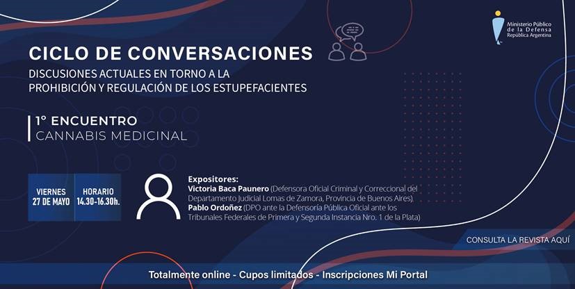 El próximo viernes 27 de mayo a las 14.30 h dará inicio el ciclo de conversaciones “Discusiones actuales en torno a la prohibición y regulación de los estupefacientes", organizado por la Secretaría General de Capacitación y Jurisprudencia de la Defensoría General de la Nación. El primer encuentro abordará la temática del cannabis medicinal y allí expondrán la defensora oficial Criminal y Correccional del Departamento Judicial de Lomas de Zamora, Dra. Victoria Baca Paunero, y el titular de la Defensoría Pública Oficial ante los Tribunales Federal de Primera y Segunda Instancia Nº1 de La Plata, Dr. Pablo Ordoñez.
