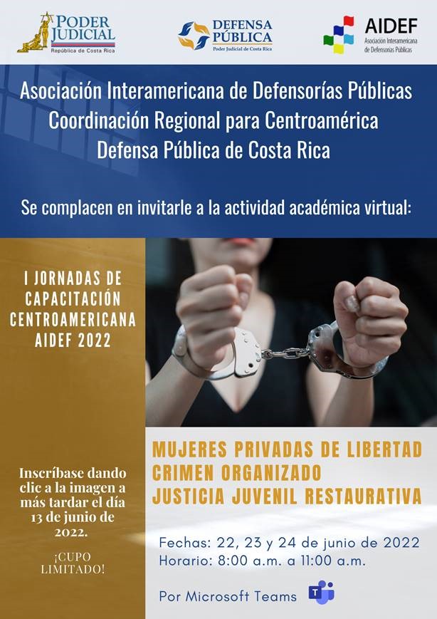 La Asociación Interamericana de Defensorías Públicas y la Defensa Pública de Costa Rica, que ejerce la coordinación regional de la asociación para Centroamérica, llevarán a cabo este mes las primeras “Jornadas de Capacitación Centroamericana AIDEF 2022”.