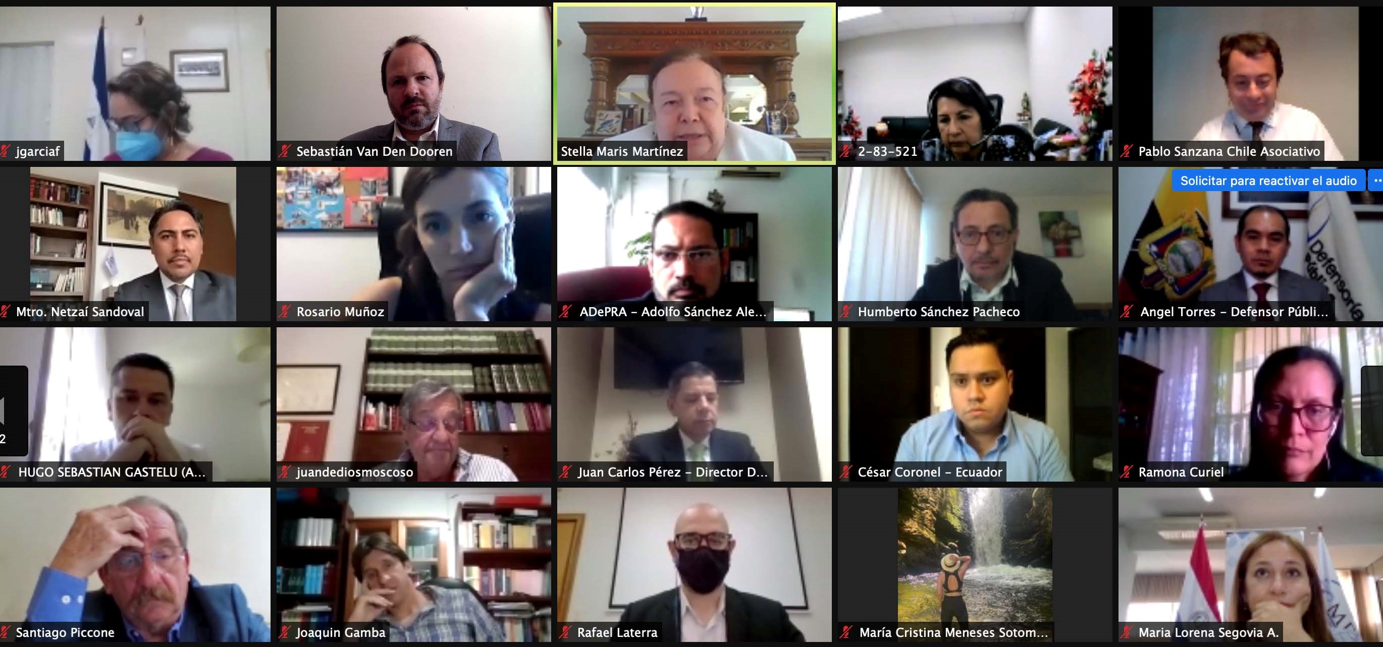 El día 16 de diciembre se llevaron a cabo por videoconferencia las reuniones del Comité Ejecutivo y del Consejo Directivo de la Asociación Interamericana de Defensorías Públicas (AIDEF). La defensora general de la Nación, Dra. Stella Maris Martínez, en su calidad de coordinadora general de AIDEF, presidió estos encuentros en los que participaron integrantes de la asociación en representación de las instituciones de defensa pública de Argentina, Brasil, Costa Rica, Chile, Ecuador, El Salvador, Honduras, México, Nicaragua, Panamá, Paraguay, República Dominicana y Uruguay.