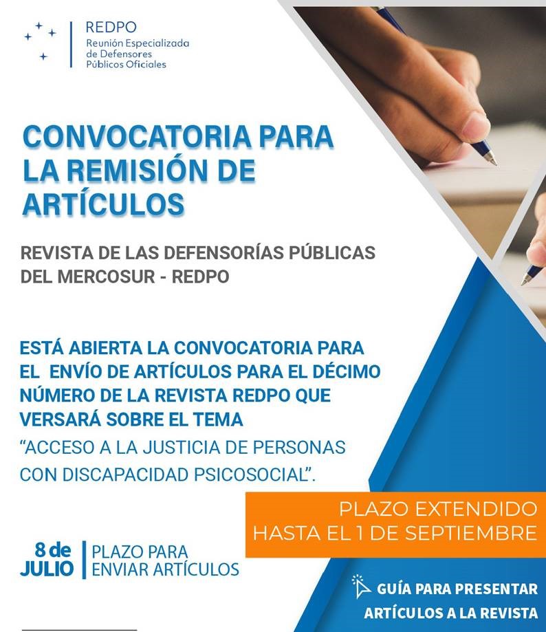 La Reunión Especializada de Defensores Públicos Oficiales del MERCOSUR (REDPO) amplió hasta el 1º de septiembre el plazo de envío de artículos para la décima edición de su revista. La temática a tratar en el nuevo número de la Revista de la REDPO es el “Acceso a la Justicia de Personas con Discapacidad Psicosocial”.