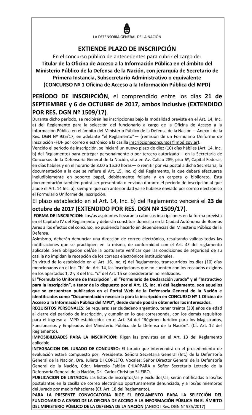 La Defensoría General de la Nación extendió hasta el 6 de octubre de 2017 el período de inscripción del Concurso Nº 1 Oficina de Acceso a la Información Pública del Ministerio Público de la Defensa (MPD), convocado para cubrir el cargo de Titular de esa dependencia. La decisión se tomó mediante la Resolución DGN Nº 1509/17.