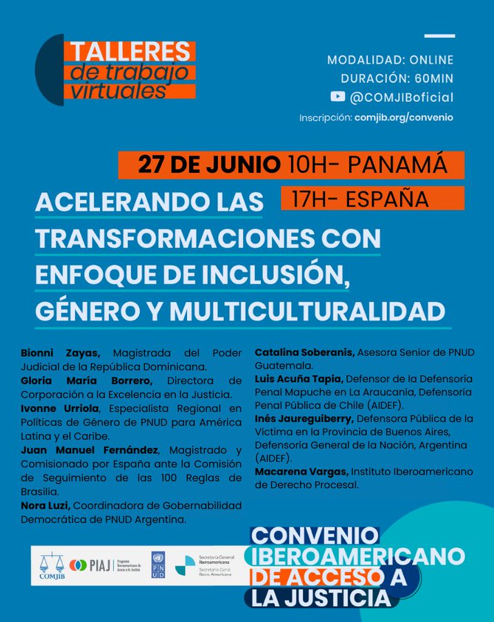 El próximo jueves 27 de junio a las 12 h de Argentina (17 h de España) tendrá lugar el cuarto taller con ocasión del Convenio Iberoamericano de Acceso a la Justicia (CIAJ), titulado “Acelerando las transformaciones con enfoque de inclusión, género y multiculturalidad”.