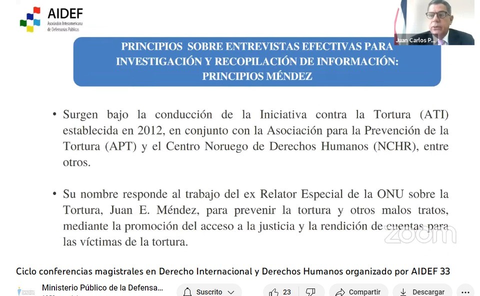 Con la conferencia “El Rol de las Defensas Públicas en la protección de los derechos humanos de las personas privadas de la libertad: Aplicación de los Principios Méndez en las visitas de monitoreo a espacios carcelarios”, dictada por la el Dr. Juan Carlos Pérez Murillo, se llevó adelante la trigésimo segunda de las conferencias magistrales pertenecientes al ciclo sobre Derecho Internacional y Derechos Humanos organizado por la Asociación Interamericana de Defensorías Públicas (AIDEF) y el Ministerio Público de la Defensa de la República Argentina (MPD).