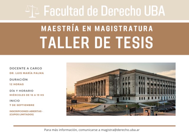 Informamos a los/as integrantes del Ministerio Público de la Defensa que se encuentra abierta la inscripción a la segunda edición del curso “Taller de Tesis”, dictado en el marco de la Maestría en Magistratura de la Facultad de Derecho de la Universidad de Buenos Aires. La capacitación se desarrollará a partir del próximo 7 de septiembre, a cargo del docente Dr. Luis María Palma.