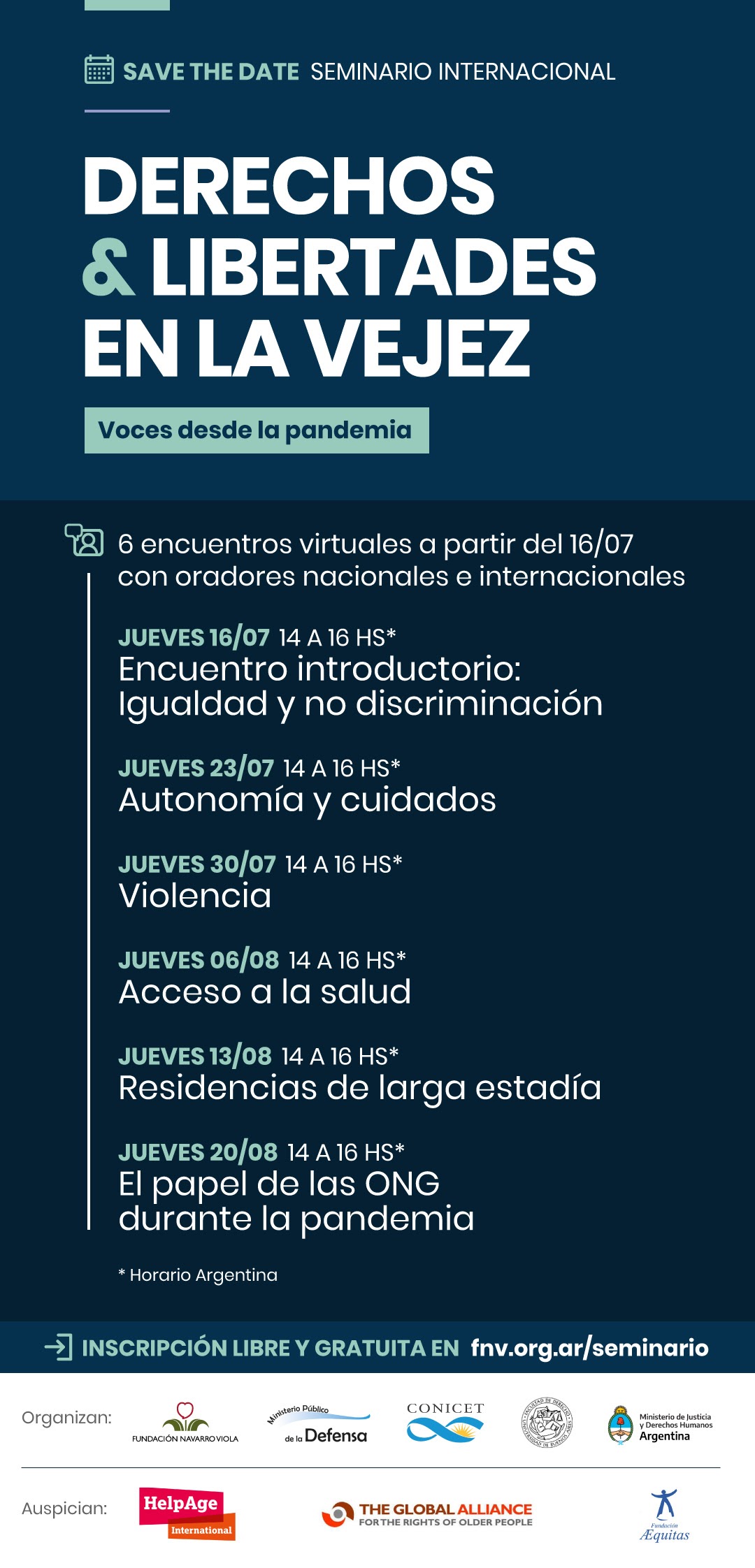 La Defensoría General de la Nación, la Fundación Navarro Viola y la Secretaría de Acceso a la Justicia, dependiente del Ministerio de Justicia y Derechos Humanos de la Nación organizan el seminario internacional de capacitación "Derechos y libertades en la vejez: voces desde la pandemia”, que se realizará vía Zoom, durante los días jueves 16/07, jueves 23/07, jueves 30/07, jueves 06/08, jueves 13/08 y jueves 20/08 a las 14 h.