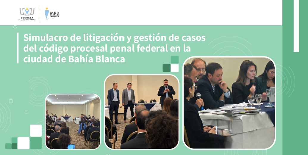 De cara al próximo 29 de septiembre, fecha en que entrará en vigencia el Código Procesal Penal Federal (CPPF) en la jurisdicción correspondiente a la Cámara Federal de Apelaciones de Bahía Blanca, el día de hoy, el Ministerio Público de la Defensa de la Nación (MPD) participó del “Simulacro de Litigación y Gestión de casos del Código Procesal Penal Federal”, organizado por el Ministerio de Justicia de la Nación en la ciudad de Bahía Blanca.