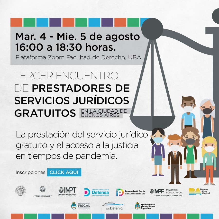 En el marco del fortalecimiento de las políticas interinstitucionales para garantizar el acceso igualitario a la justicia, los próximos 4 y 5 de agosto se realizará de manera virtual el “Tercer Encuentro de la Red de Prestadores de Servicios Jurídicos Gratuitos en la Ciudad Autónoma de Buenos Aires - La prestación del servicio jurídico gratuito y el acceso a la justicia en tiempos de pandemia”.