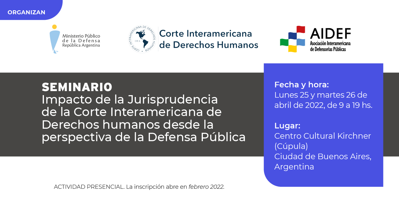Los días 25 y 26 de abril de 2022 tendrá lugar en la cúpula del Centro Cultural Kirchner (Sarmiento 151, CABA, Argentina) el seminario "Impacto de la Jurisprudencia de la Corte Interamericana de Derechos Humanos desde la perspectiva de la Defensa Pública”, organizado por la Asociación Interamericana de Defensorías Públicas (AIDEF), la Corte Interamericana de Derechos Humanos (Corte IDH) y el Ministerio Público de la Defensa de la Nación.